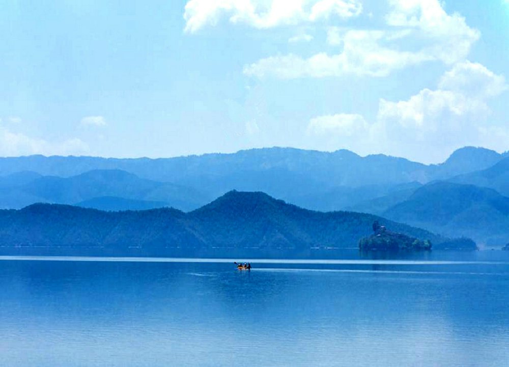 天空湛蓝,几条薄云型如丝带,越拉越远,湖面如镜,看上去更加湛蓝。云谈风轻,湖光山色,也不知让多少游人在此迷醉。泛舟而游,船浆打破湖面,荡起层层涟漪。水清澈无比,不知藏着泸沽湖多少年的沉淀。平静的湖面上,划过一叶孤舟。湖边的水面上,漂浮着一片片白色的花瓣。