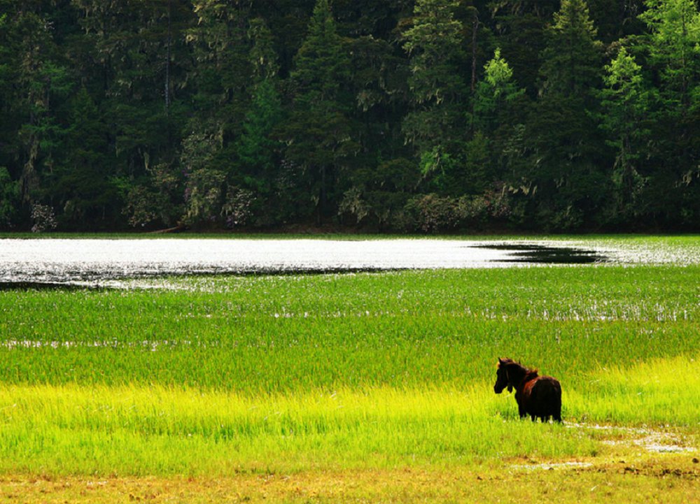 藏语“碧塔”是栎树成片的地方。藏语中碧塔海又意为宁静的海。在晴朗的日子里观赏春天的碧塔海,别有情致。湖畔四周,苍松古栎,遮天蔽日,碧塔海被黛色的群山环抱,像一颗镶嵌在群山中的绿宝石。湖水清澈明亮,在太阳缕缕金辉照耀下,闪闪熠熠,奇秀悦目。高山临湖,山光水色融为一体,真可谓“半湖青山半湖水”。湖周围杜鹃花绚丽灿烂,湖畔鸟语花香,游鱼游曳于浅滩岸边。从杜鹃花海中向外望去,在广阔的草甸上,成群的牛羊悠然徜徉于鲜花点缀的草甸上,湖光与草原由此相映成趣。